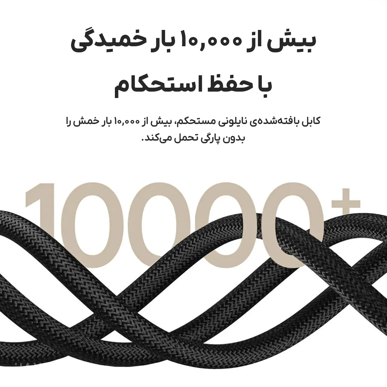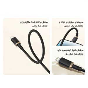 انواع گوشی های موبایل، آیپد و دیگر دستگاه های مجهز به لایتنینگ, شارژ و انتقال اطلاعات, رشتههای مسی ضخیم و باکیفیت (برای کاهش مقاومت و افزایش سرعت شارژ), سازگار با فناوری Power Delivery (PD) 20W/18W (هنگام استفاده با آداپتور PD مناسب), مقاوم در برابر پارگی، کشش و گره خوردن به دلیل بافت متراکم / دارای محافظ داخلی در برابر ولتاژ و جریان بیش از حد