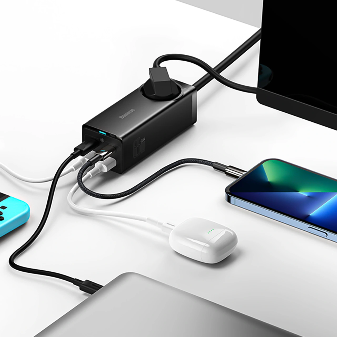مشخصات شارژر رومیزی بیسوس مدل CCGAN65-1ACE با توان خروجی 65 وات، شارژ سریع 4 دستگاه همزمان و پریز برق